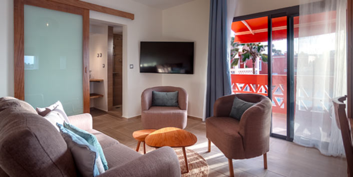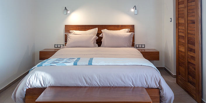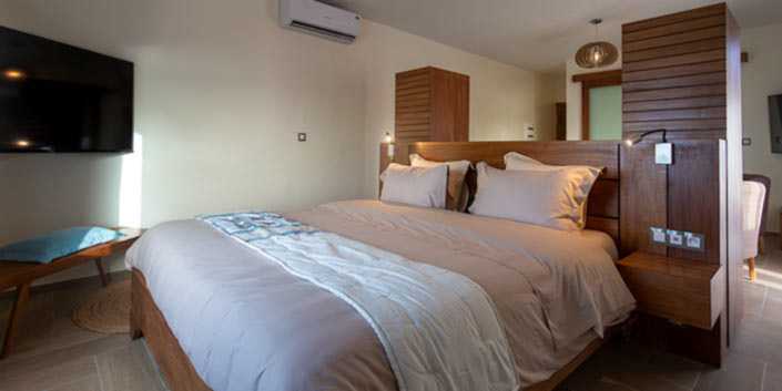 Dos habitaciones con baño propio, un amplio salón con sofá-cama y una gran terraza con vistas al mar y a la isla de Ngor. Los apartamentos le ofrecen espacio, confort y espectaculares atardaceres para disfrutar junto a los suyos.