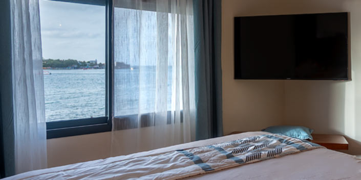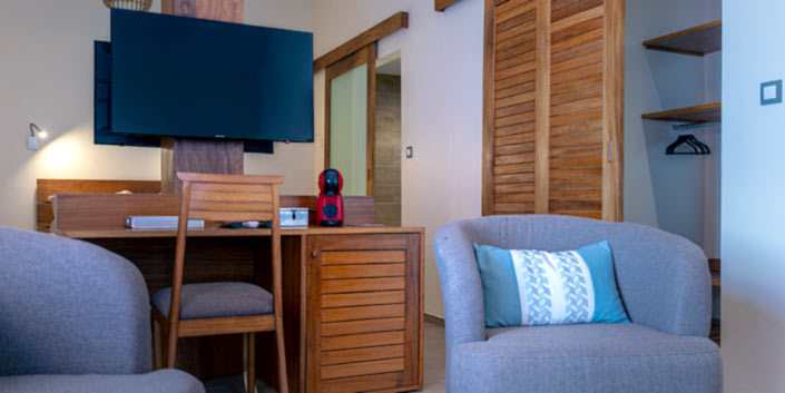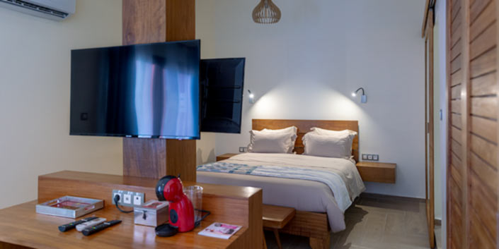 Habitaciones dobles o triples, cómodas y alegres. Ponemos dos tipos de habitación a su disposición, las de la zona de relax al lado de la piscina y las que cuentan con terraza privada con vistas a la espectacular isla de N'gor.