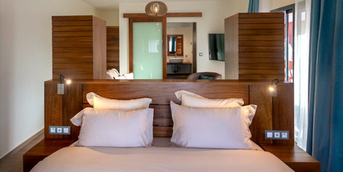 Las suites de la Madrague son perfectas para vivir un sueño de verano. Cuentan con un vestidor separado, baño con ducha y un dormitorio muy amplio con una terraza privada sobre la bahía de N'gor.